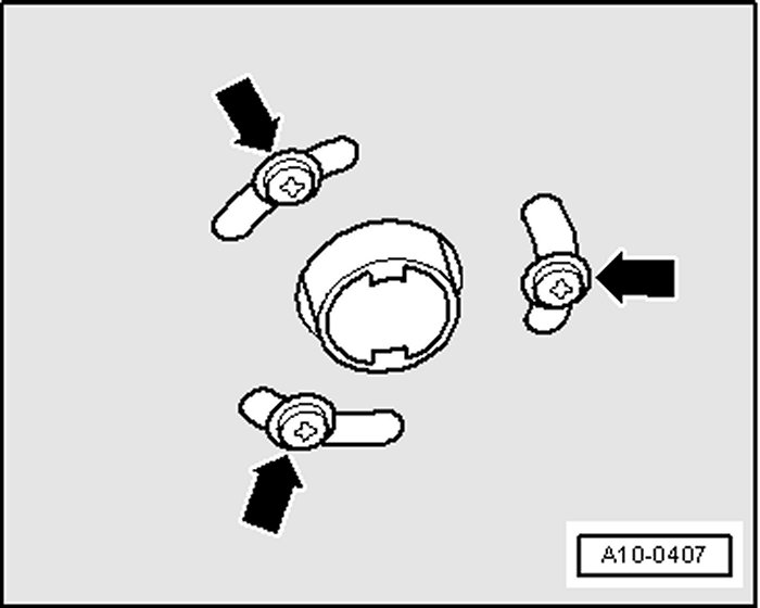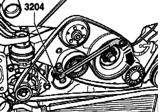- To tension ribbed belt, turn tensioner clockwise (arrow) with 19 mm ring wrench and remove pin 3204.