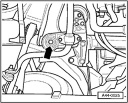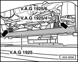 - Insert VAG 1925 spacer together with VAG 1925/4 adapters and screw both threaded spindles out until they just rest against front subframe bolts (arrow).