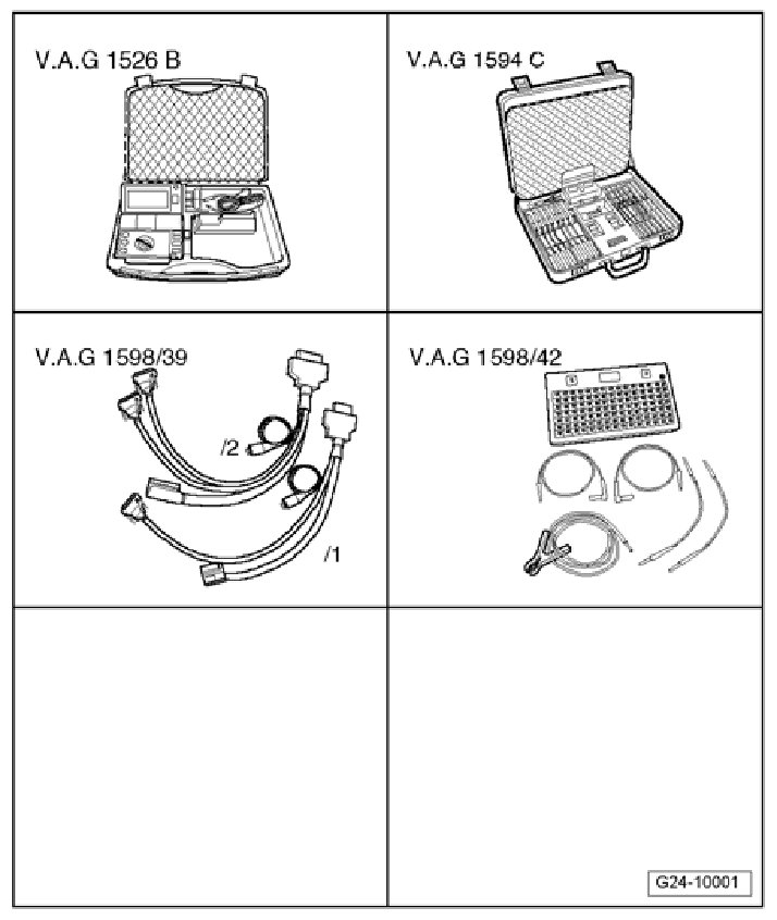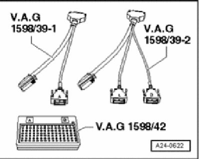 - Connect test box V.A.G 1598/42 to wiring harness with adapter cable V.A.G 1598/39-1 or adapter cable V.A.G 1598/39-2 ; engine control module (ECM) remains connected. Clamp test box Ground (GND) clip to battery negative terminal.