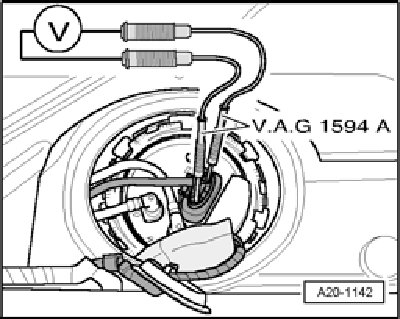 - For voltage testing, connect hand multimeter V.A.G 1526 B with measuring probes and connector adapters from connector test set V.A.G 1594 C or V.A.G 1594 A between clamp - 1 - and - 4 -, as shown in illustration. The electrical connection remains connected.