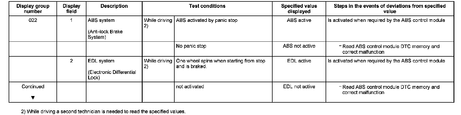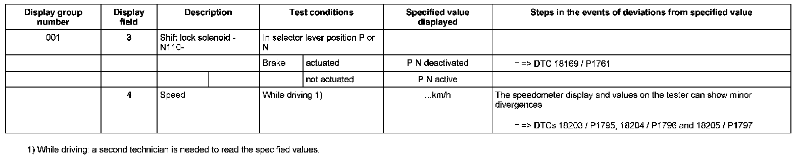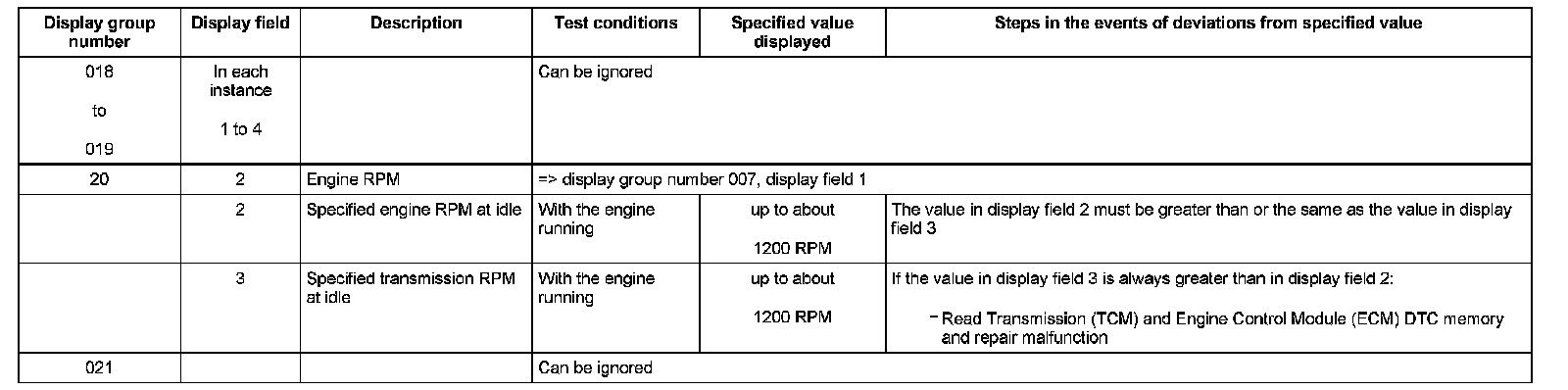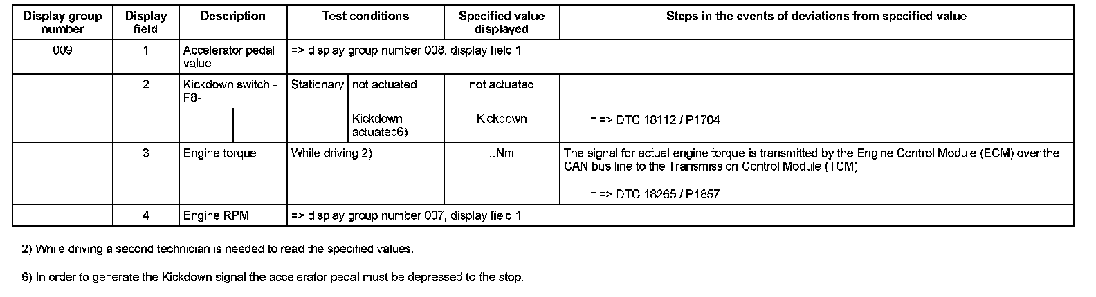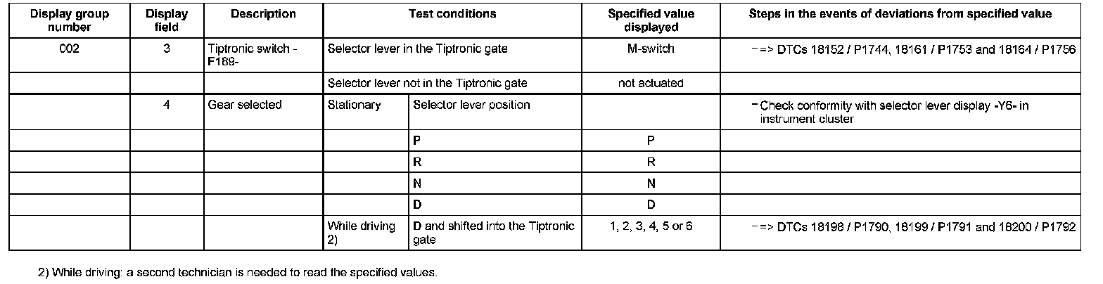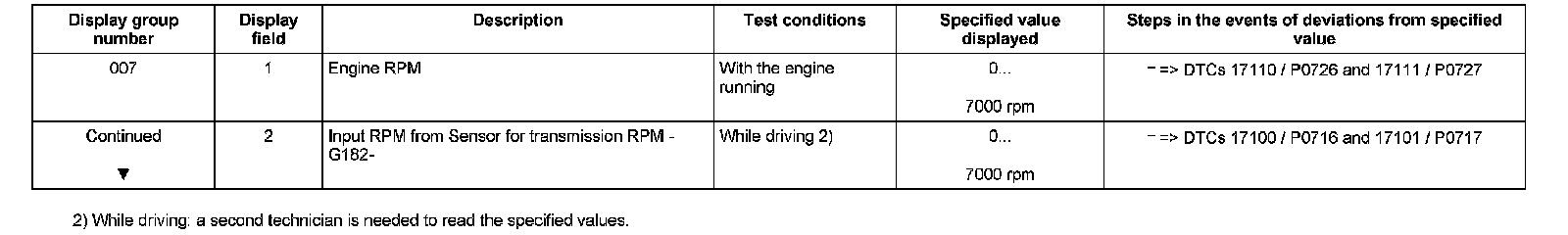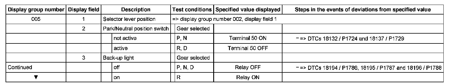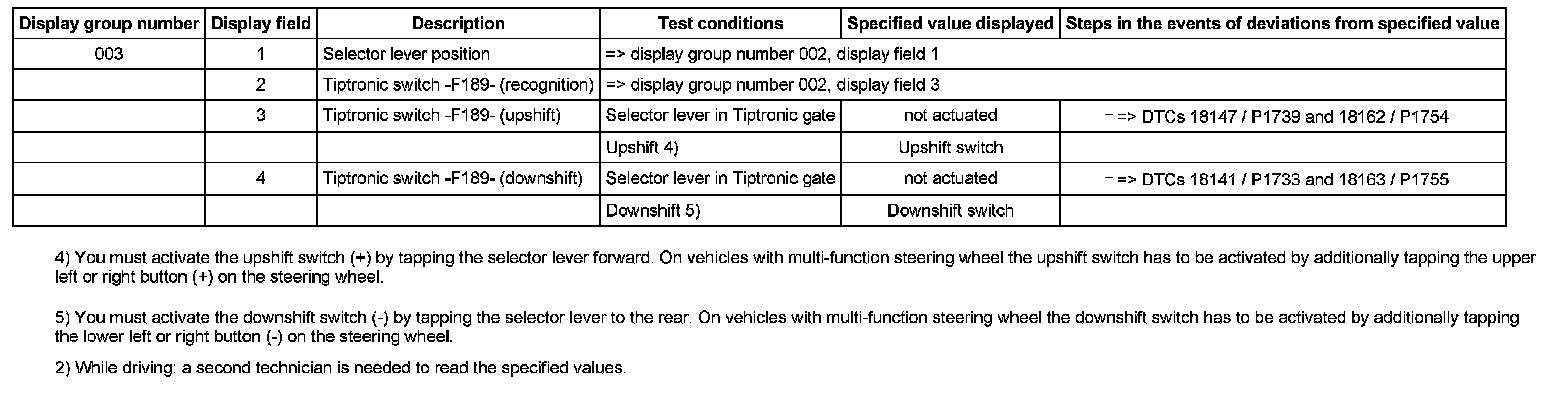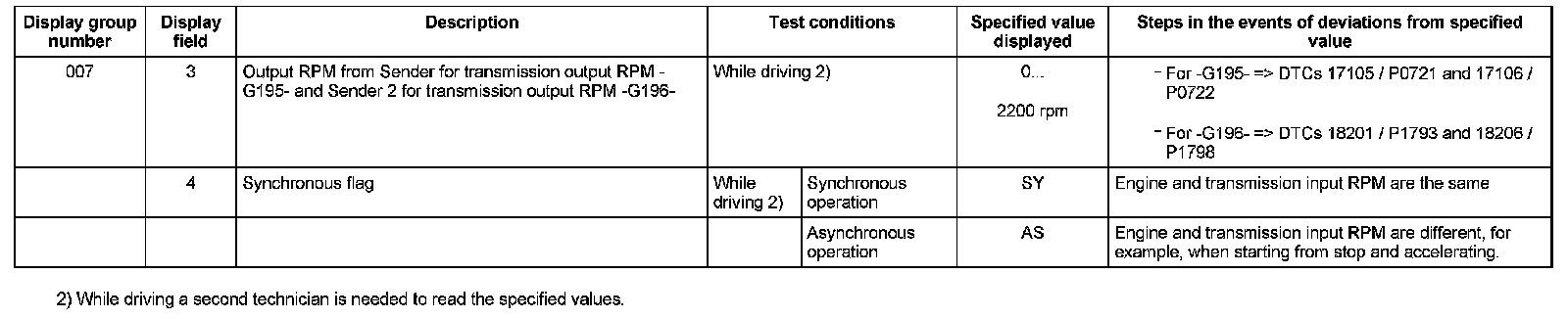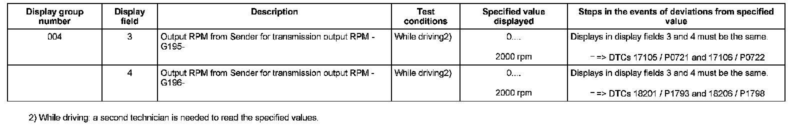 ^ If "0 RPM" is shown in display field 3 or 4, the corresponding sender is faulty and the Transmission Control Module (TCM) must be replaced.