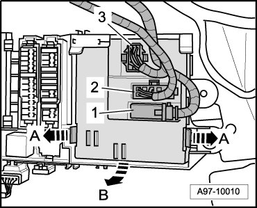 - Release the springs - arrows A - and remove the comfort system central control module (J393) from the relay and fuse panel - arrow B -.
