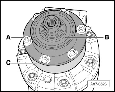 - Check run-out of drive plate - B - again => [ Drive Plate with Overload Protection, Checking Run-Out and Adjusting ] Adjustments.