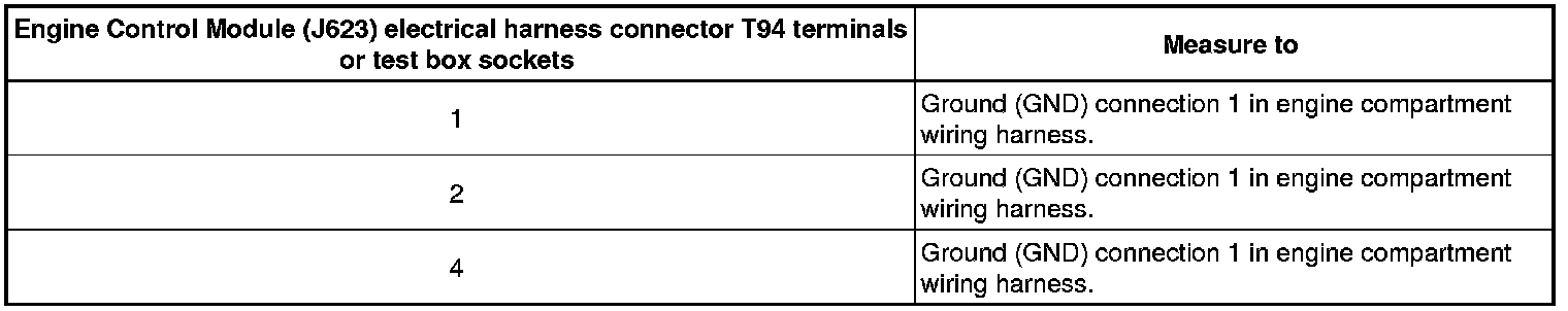 - Check the Engine Control Module (J623) electrical harness connector T94 terminal 19,64,87 to the Engine Component Power Supply Relay (J757) socket 2/30for an open circuit or short to Ground (GND).