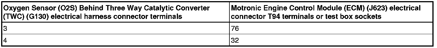 - Using a multimeter, check the Oxygen Sensor (O2S) Behind Three Way Catalytic Converter (TWC) (G130) electrical harness connector terminals to the Motronic Engine Control Module (ECM) (J623) electrical harness connector T94 terminals for an open circuit according to the wiring diagram.
