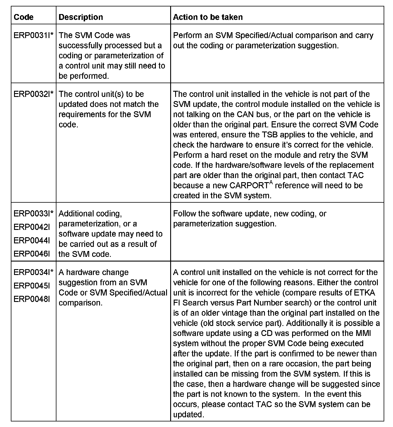 A hardware change suggestion will occur when SVM does not recognize the control module as valid for the vehicle. As stated before, there is a conflict between specified (i.e. reference) and actual hardware/software part number or software versions. If there is no customer concern and no DTC regarding this control module, report the issue then first ensure you have the correct part installed. Then check to see if there is an applicable TSB indicating an SVM XCHG code is required. Finally, if no part issue is found and no supporting TSB is found, then contact the Technical Assistance Center (TAC) with the required information specified in the Additional Information section below. For MMI control units, it is possible the SVM code for feedback documentation was not performed after an update via CD was performed. Always report MMI issues to the TAC before attempting a repair.