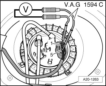- For voltage testing, connect the (V.A.G 1526C) with measuring probes and connector adapters from the (V.A.G 1594C) between clamp - 1 - and - 5 -, as shown in the illustration. The electrical connection remains connected.