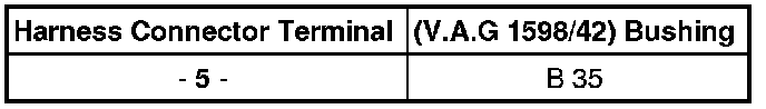 - Connect (V.A.G 1598/42) to wiring harness with (V.A.G 1598/39-1) or (V.A.G 1598/39-2); engine control module (ECM) is not connected. Clamp test box ground (GND) clip to battery negative terminal.