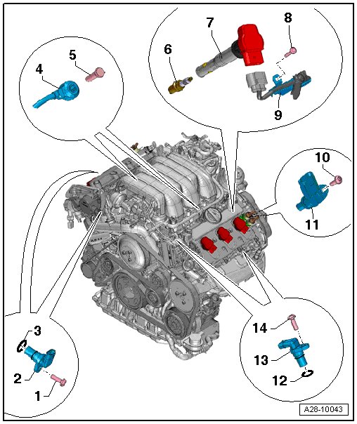 • Camshaft position sensor, removing and installing, intake side, refer to => [ Camshaft Position Sensor (G40)/(G163), Intake Side ] Camshaft Position Sensor (G40)/(G163), Intake Side