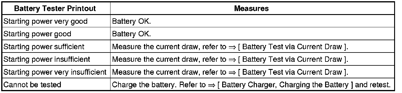 • If the battery tester does not start (no LED lights up, no printout), the battery must be charged. Refer to => [ Battery, Charging ] Battery, Charging.