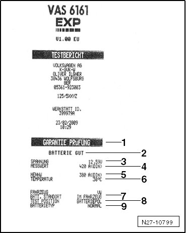 When performing the battery test with the battery tester (VAS 6161), the battery ground cable must not be disconnected.