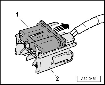 - Press catch - 1 - in direction of - arrow - until harness connector - 2 - disengages.