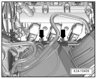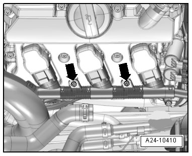 - Remove the bolts - arrows - and disconnect the connectors on the ignition coils.