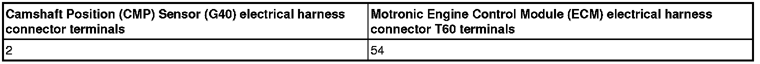 - Using a Multimeter, Check the Camshaft Position (CMP) Sensor (G40) electrical harness connector to the Motronic Engine Control Module (ECM) electrical harness connector T60 for an open circuit.
