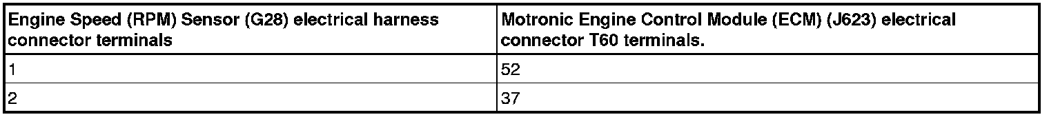 - Using a Multimeter, check the Engine Speed (RPM) Sensor (G28) electrical harness connector terminals to the Motronic Engine Control Module (ECM) (J623) electrical harness connector T60 terminals for an open circuit.