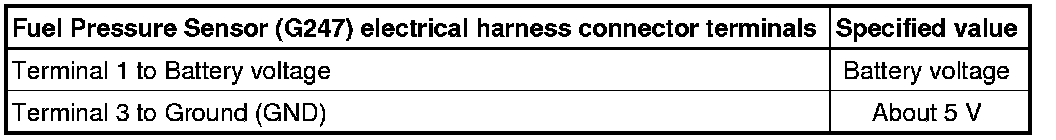 - Using a Multimeter, check the Fuel Pressure Sensor (G247) electrical harness connector terminals for voltage.