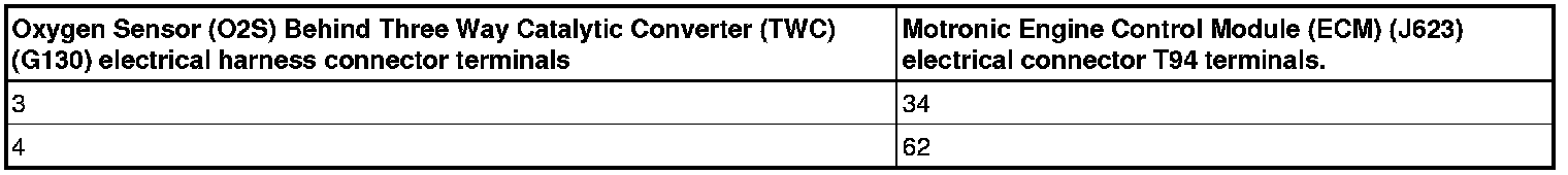- Using a Multimeter, check the Oxygen Sensor (O2S) Behind Three Way Catalytic Converter (TWC) (G130) electrical harness connector terminals to the Motronic Engine Control Module (ECM) (J623) electrical harness connector T94 terminals for an open circuit according to the wiring diagram.