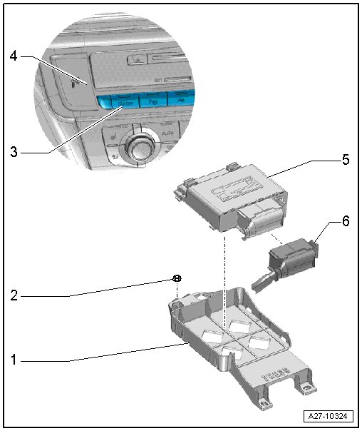 • Removing and Installing, refer to => [ Switch Unit with Start/Stop Mode Button, Parking Aid Button, Front Passenger Airbag -Disabled- Indicator Lamp, Rear Spoiler Adjustment Switch and ASR/ESP Button ] Unit With Start/Stop Mode Button, Parking Aid Button, Front Passenger Airbag-Disabled-Indicator Lamp, Rear Spoiler Adjustment.