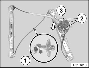 When removing, first feed out front part (1) of window lifter with drive (2).