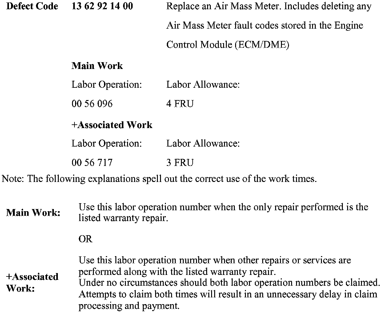 S54B32 - Special Limited Air Mass Meter Warranty of 7 Years/70,000 Miles