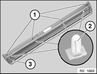 Carefully lever out finishing strip (1) with special tool 00 9 318 (universal wedge) from clips (2) towards top.