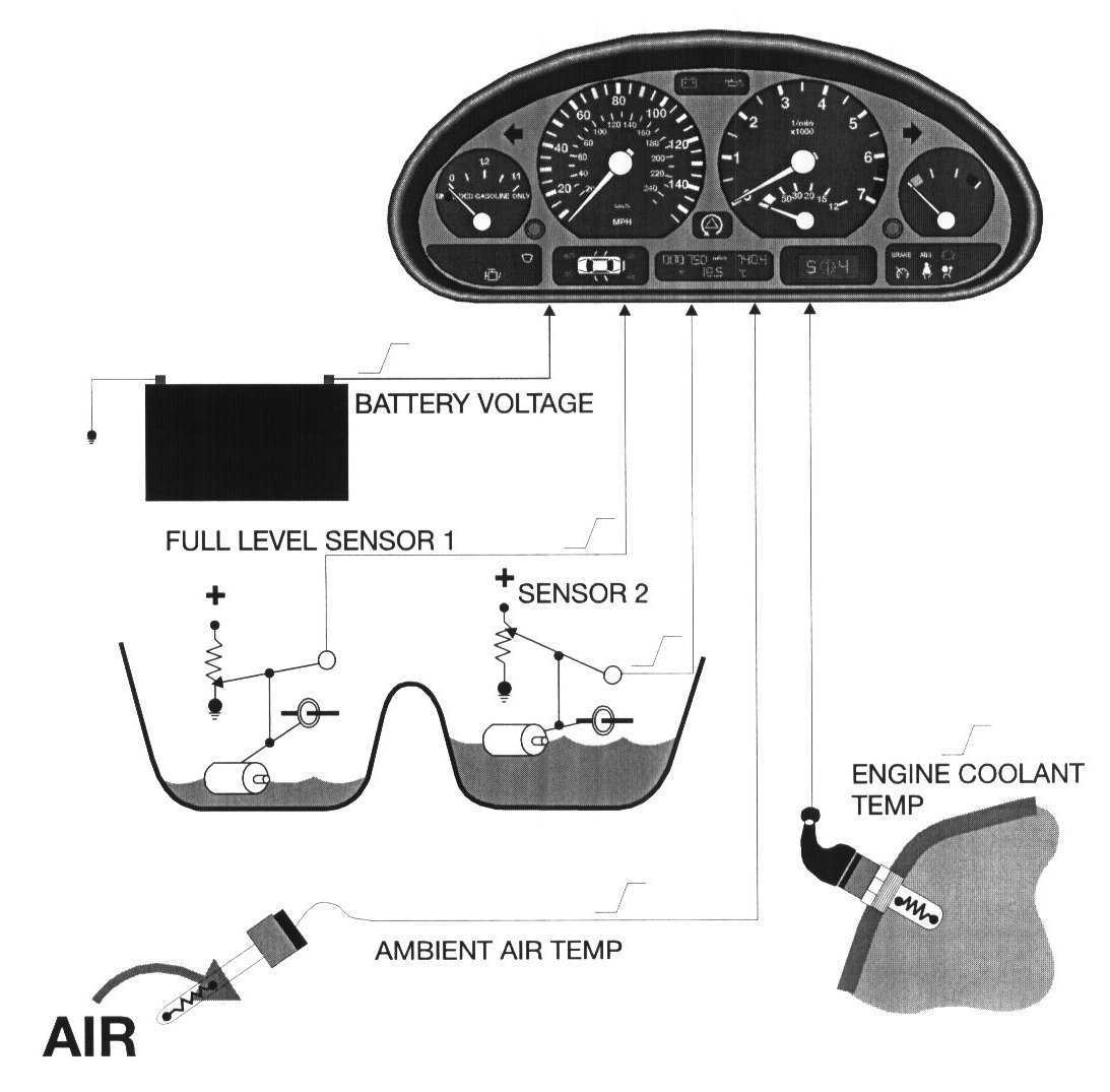 Fuel Tank Level - Two lever action sensors are wired in parallel to the cluster. The two varying voltage signals are processed by the cluster for fuel gauge and low fuel warning display.