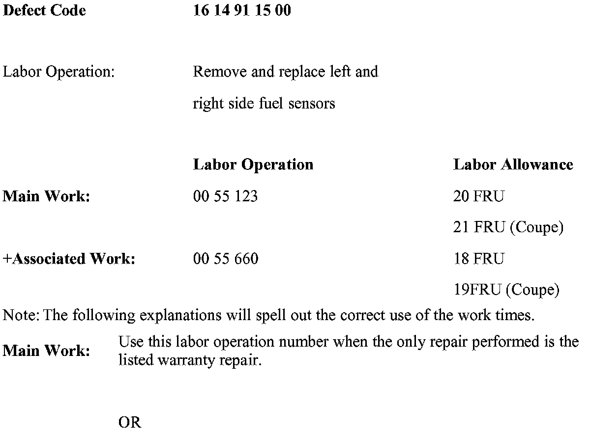 On a customer complaint basis only, remove and replace both fuel level sensors with improved gold contact sensors (refer to repair instructions 16 12 000 and 16 12 001).
