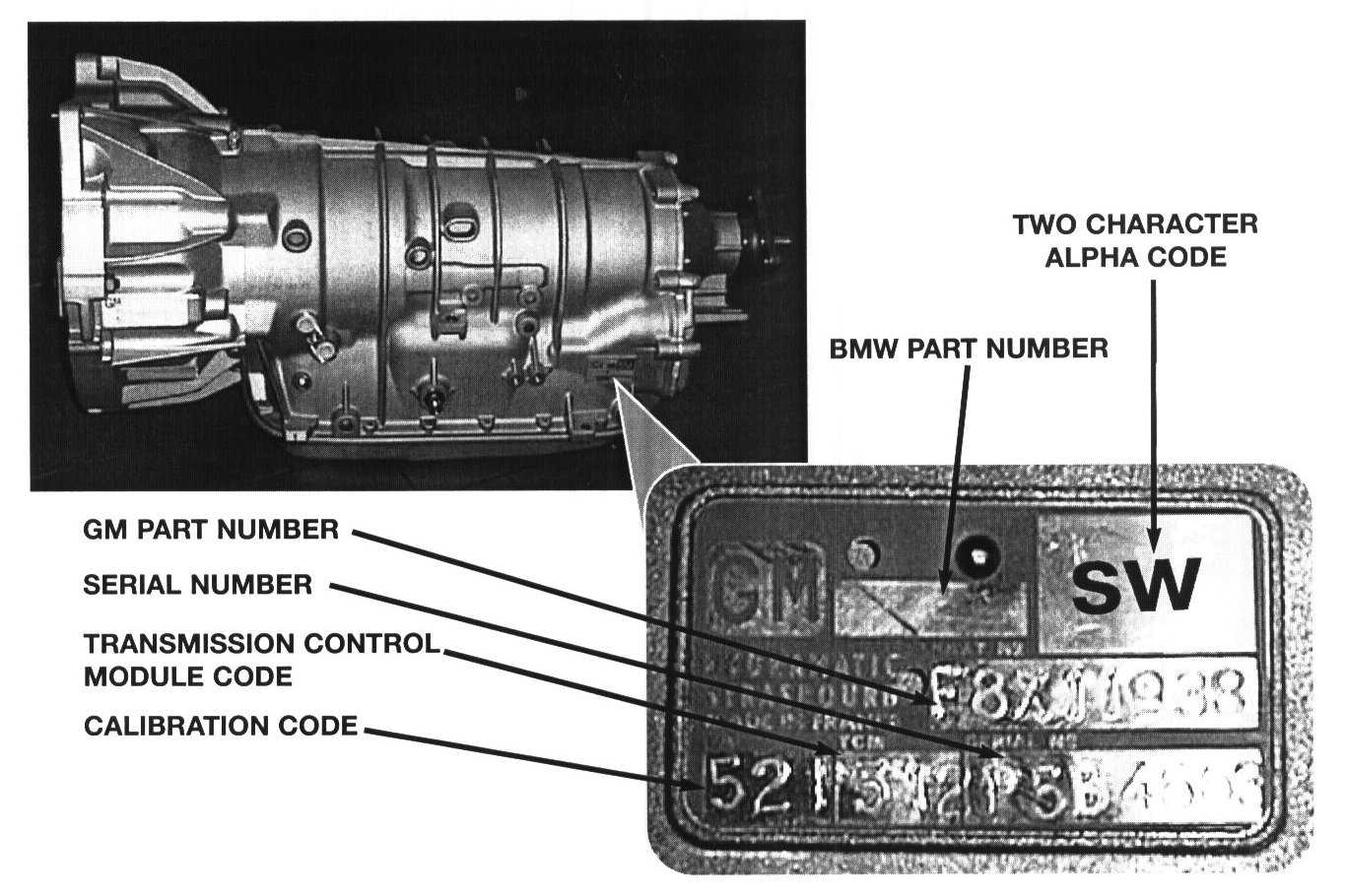 As with all BMW transmissions, an identification plate is attached to the transmission housing. The plate provides a two character alpha code signifying identification.