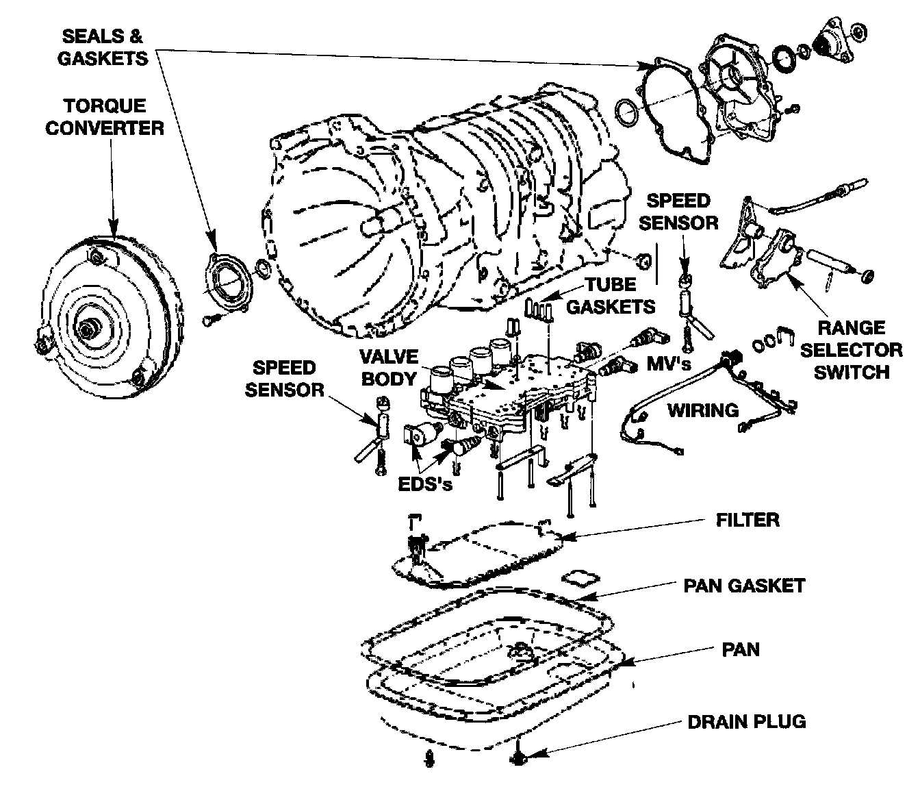 Electrical Faults - Shift Solenoids. Torque converter pressure regulator and Main Line oil pressure regulator; Wiring harness (fluid temperature sensor), Range Selector Switch, Turbine and output speed sensors.