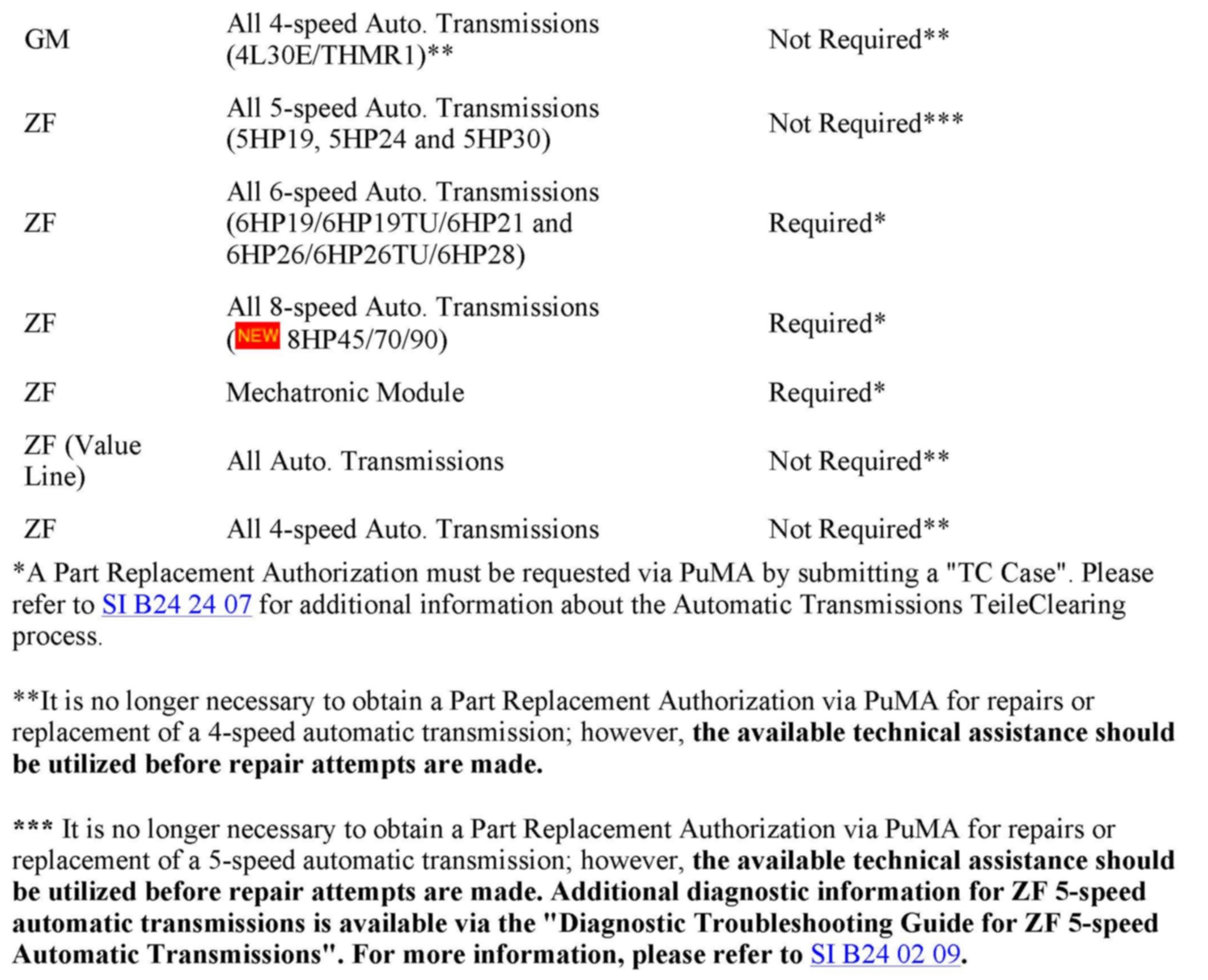 All 5-speed and 6-speed automatic transmissions manufactured by GM; all 6-speed and 8-speed automatic transmissions manufactured by ZF; and GM VB-TEHCM modules and ZF Mechatronic modules replaced without a prior Part Replacement Authorization in PuMA will result in the warranty claim being rejected. When submitting a warranty claim, the PuMA TC case number must be specified in the comment section.