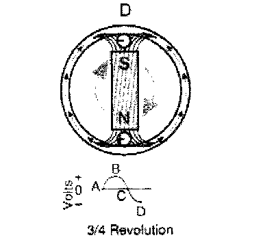 With the South pole now approaching the winding voltage begins to increase negatively. When the South pole reaches 90° to the winding, again the maximum amount of flux lines are acting on the winding and induced voltage is at its greatest negative value (3/4 turn).