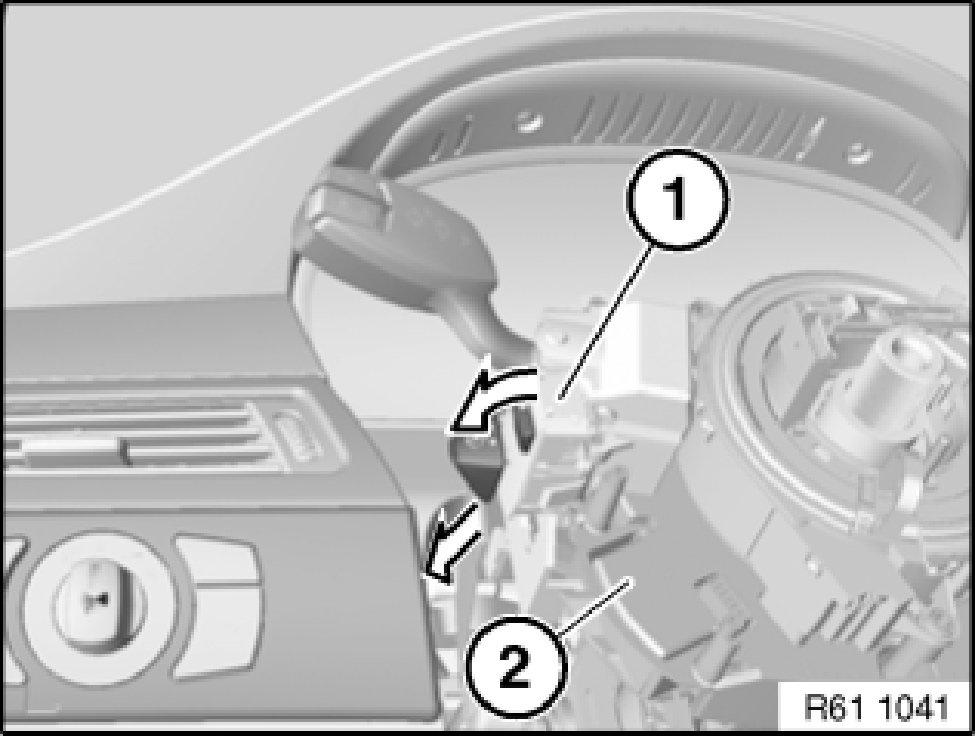Remove steering column adjustment switch (1) towards front from fixture for steering column stalk (2).