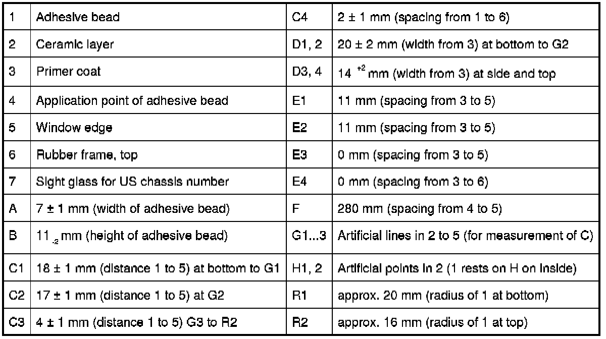 Markings (G, H) are on windscreen in bottom corners. Apply primer or adhesive at correct distance to windscreen edge (5) (wind noises, leaks).