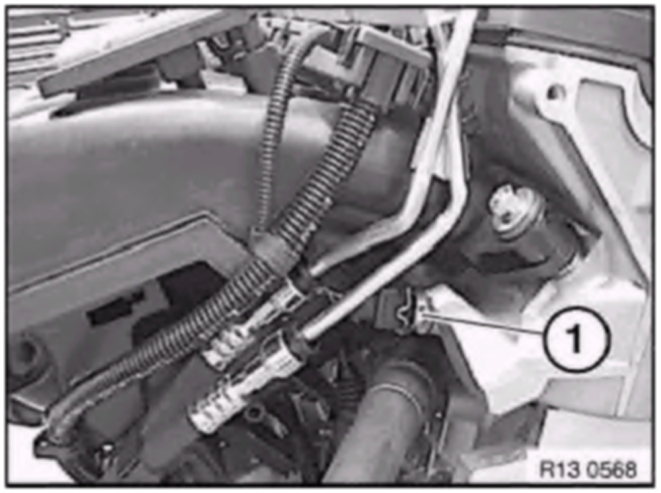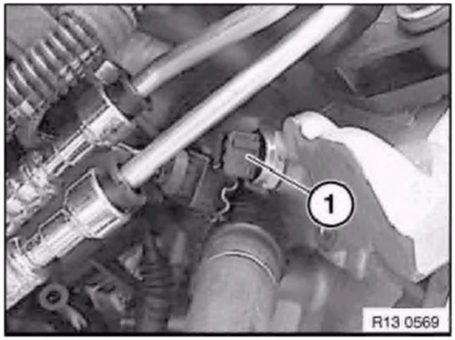 Coolant temperature sensor (1) is fitted below intake air manifold in cylinder head of cylinder 6.