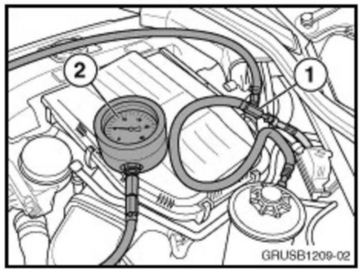 5. If the minimum threshold of 4.75 bars was not reached, further diagnose the low-pressure system using test module B1214_DI KDR, Fuel Pressure Control (possibly defective electric fuel pump or fuel filter/pressure regulator).