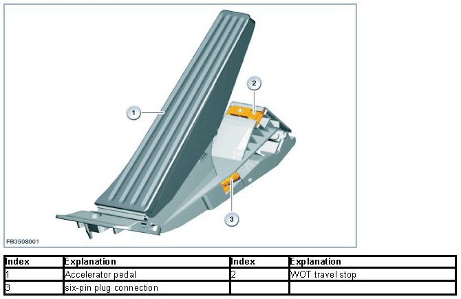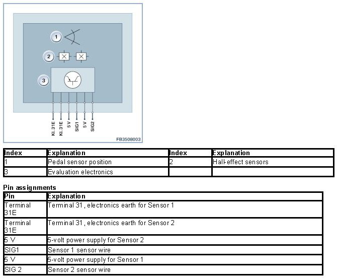 Accelerator pedal position is monitored separately by 2 individual sensors. Two sensors are employed to provide redundancy, implement the monitoring function and facilitate recognition of malfunctions.