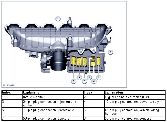 The Digital Engine Electronics (DME) are attached to the intake system close to the engine. This means the Digital Engine Electronics (DME) are cooled by the intake air. The design of the plug connections between the wiring harness and the DME digital engine electronics module ensures they remain sealed against water when the connectors are plugged in.
