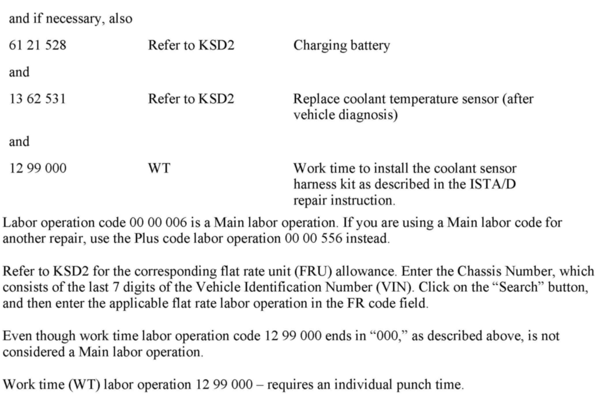 Follow the ISTA D Repair Instruction: 12 51 xxx - Exchanging plug-in contact of coolant temperature sensor (S65).