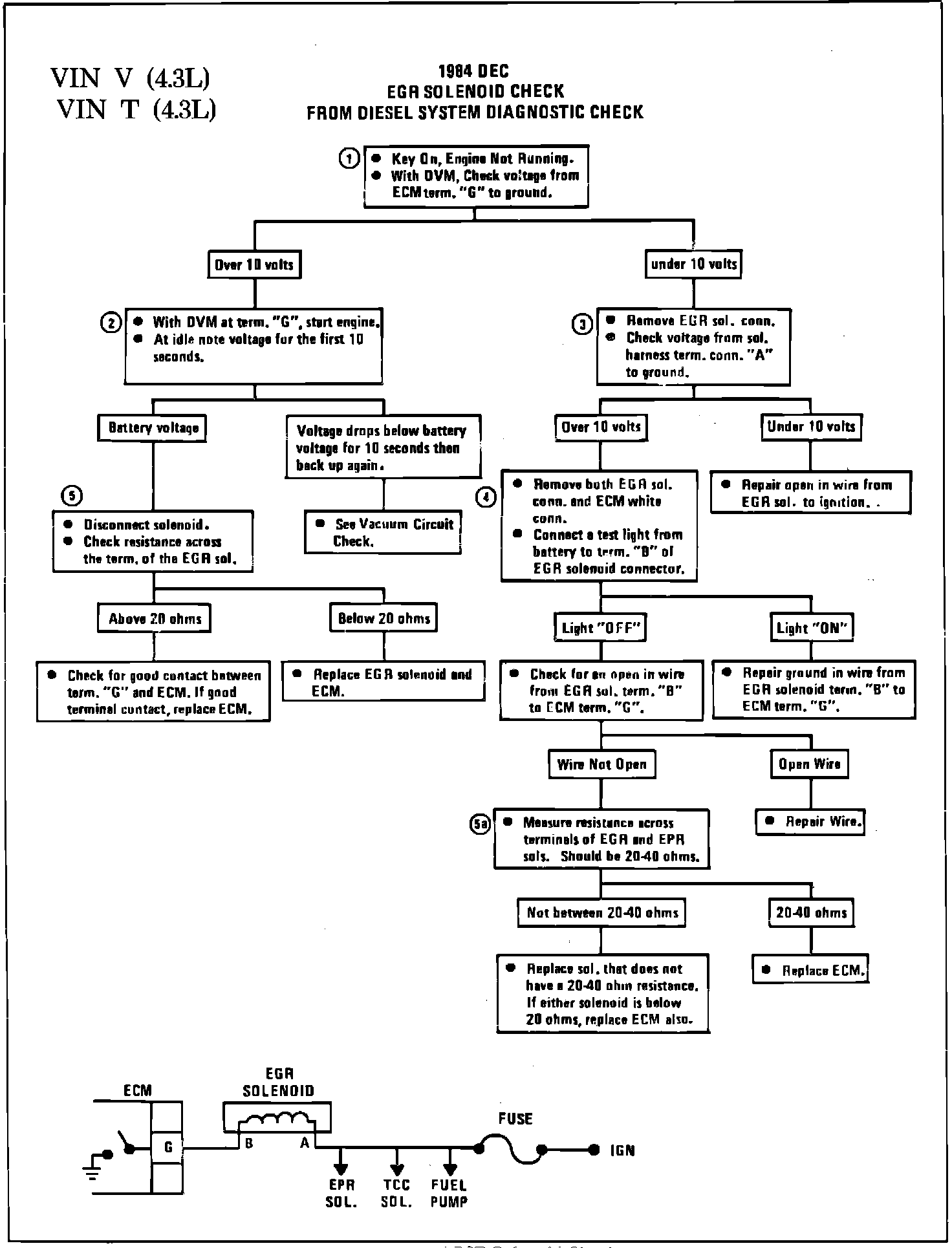 5. and 5a. Checks for proper resistance of EGR and EPR solenoids. Normal reading for a good solenoid is between 20-40 ohms. If less than 20 ohms, ECM damage will result, and ECM must be replaced along with the solenoid. If resistance is 20 ohms or above, no ECM damage will occur.