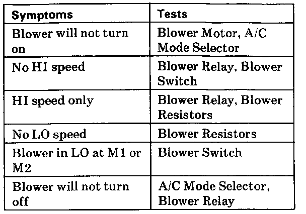 This table lists components to test for specific symptoms. If the car's symptoms are not in the table, test all blower system components.