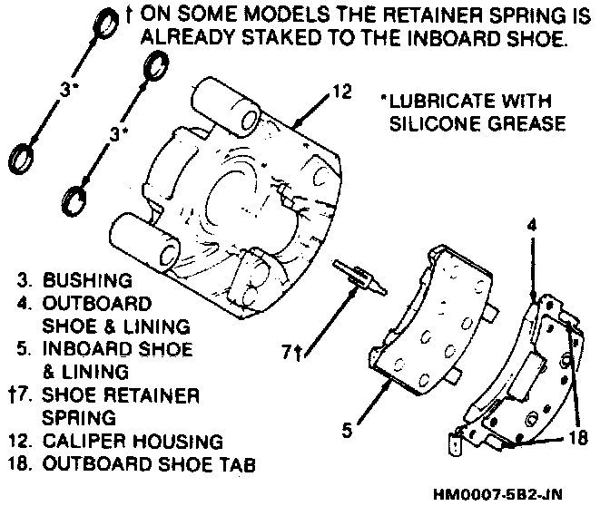 NOTE: If an outboard shoe is removed from the caliper, or the tabs unclinched for any reason, then it will be necessary to replace the shoe and lining assemblies. Do not re-clinch outboard shoe locking tabs after having removed shoe from caliper