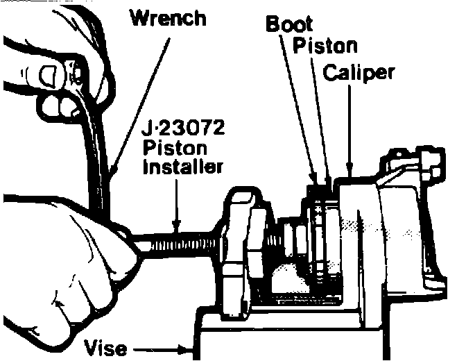 8. With piston installer tool No. J-23072 or equivalent push piston fully into caliper housing, Fig. 5. The piston must be pushed straight into caliper to prevent damage to the actuator screw seal as it passes through hole in rear of piston bore.