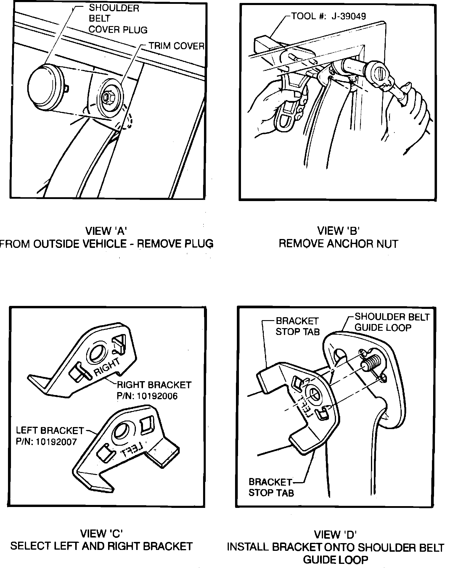 4. Working on the outside of vehicle, install appropriate bracket for the door being repaired onto back side of shoulder belt guide loop. Insert locators on bracket into the depressions in the back of the shoulder belt guide loop (Fig. 2, View "D").