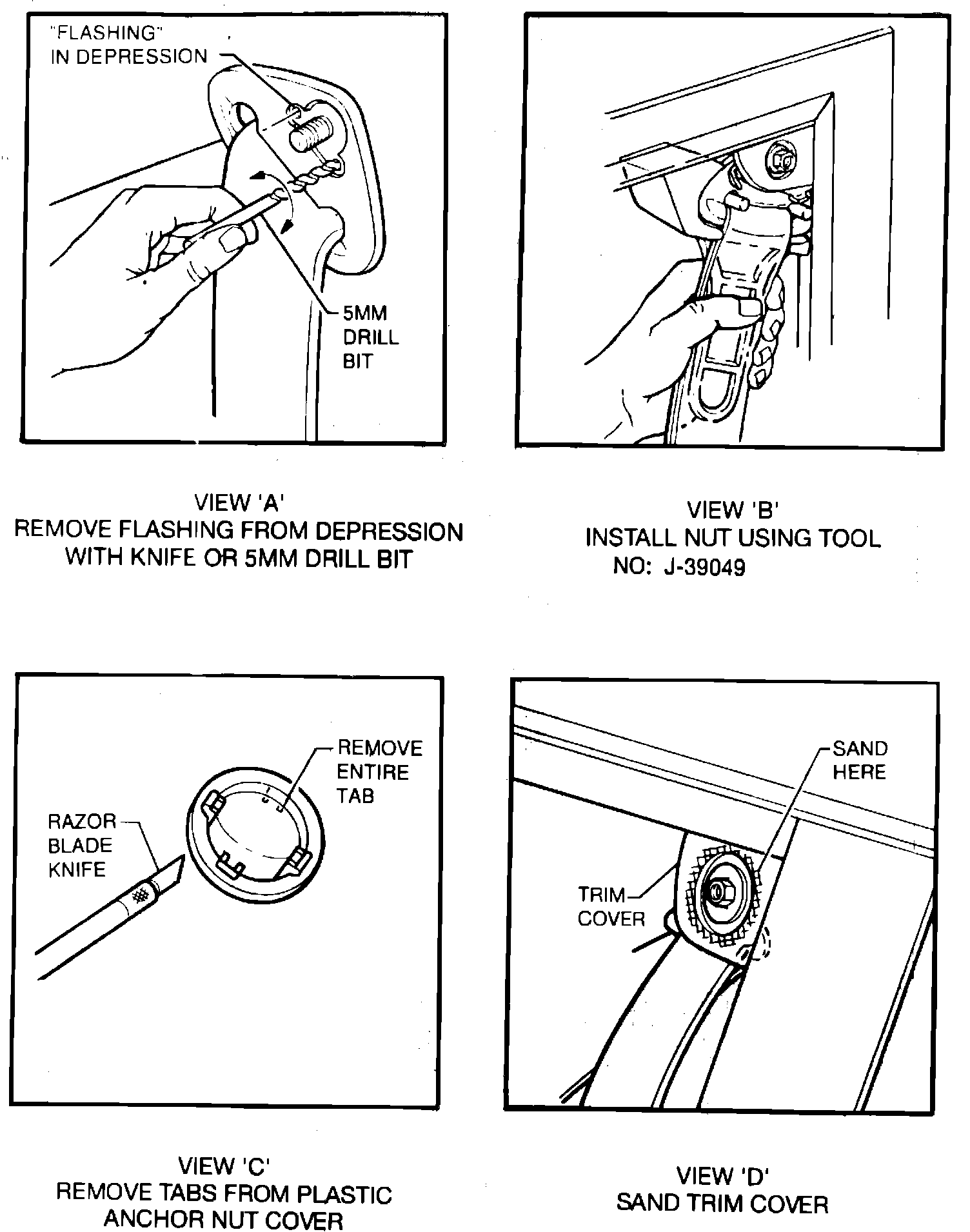 8. Using a sharp knife or razor blade, remove retaining tabs from plastic anchor nut cover. Be sure to remove entire tab so that a flat surface remains as shown in Figure 3, View "C".