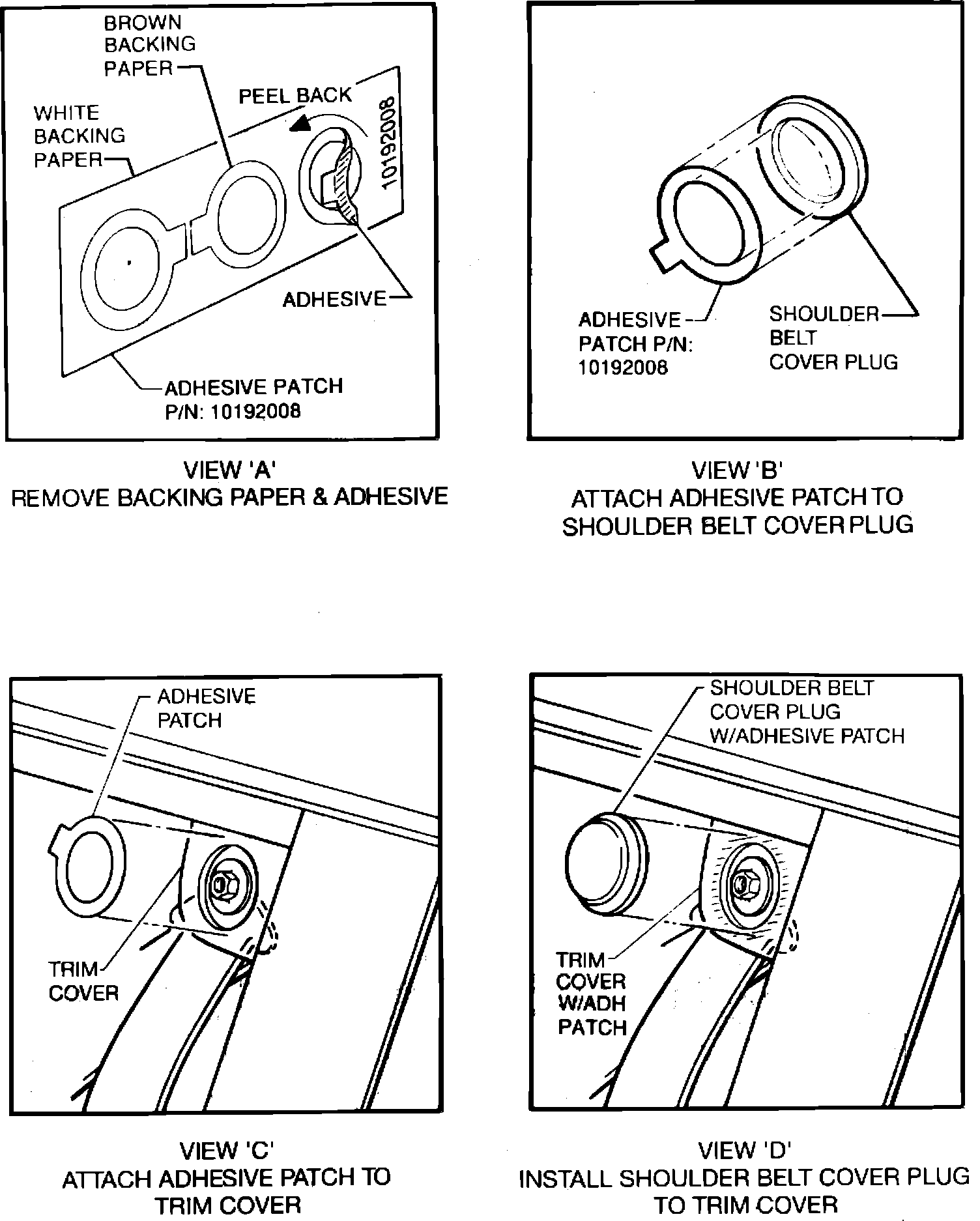 13. Affix plastic shoulder belt cover plug to the trim cover, taking care to center cap over hole and adhesive area (Fig. 4, View "D").