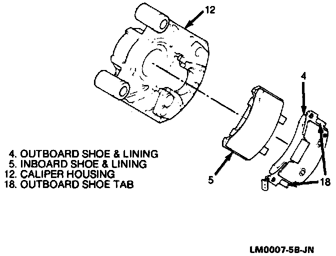 NOTE: If an outboard shoe is removed from the caliper, or the tabs unclinched for any reason, then it will be necessary to replace the shoe and lining assemblies. Do not re-clinch outboard shoe locking tabs after having removed shoe from caliper.