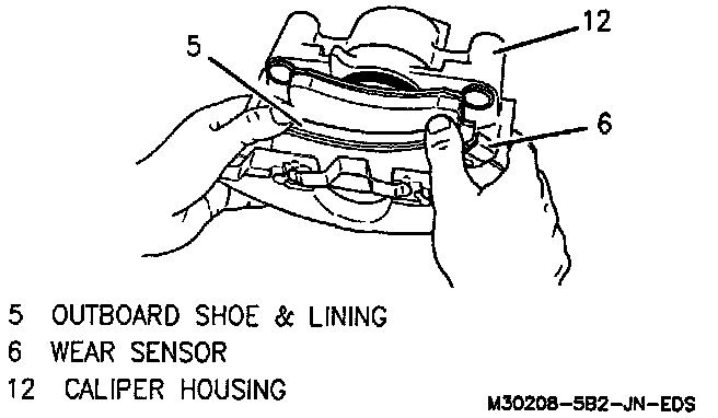 5. Install outboard shoe and lining with wear sensor at leading edge of shoe. During forward wheel rotation, the back of the shoe must lay flat against caliper.