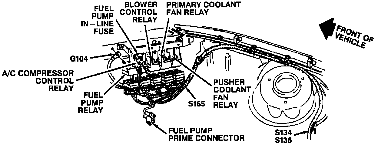The A/C relay is mounted to the multi use relay bracket, located in the front right of engine compartment.