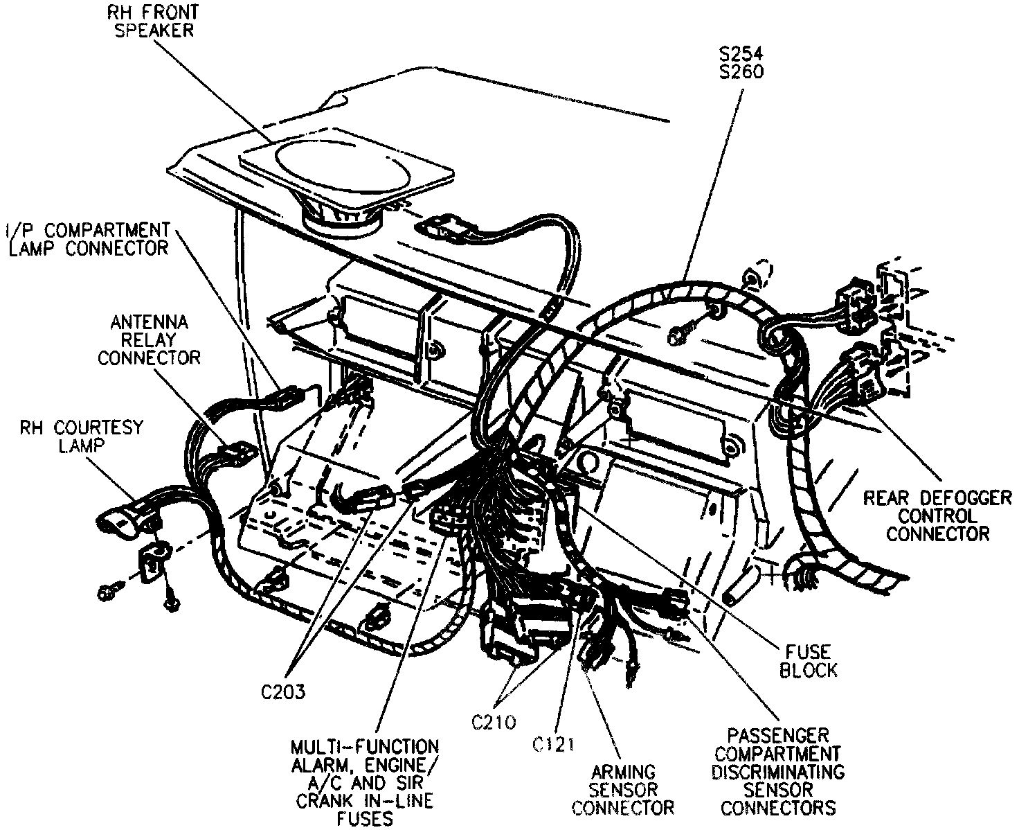 The Multi-Function Alarm, Engine/A/C, and SIR Crank In-line fuses are located behind the I/P fuse block taped in the harness.
