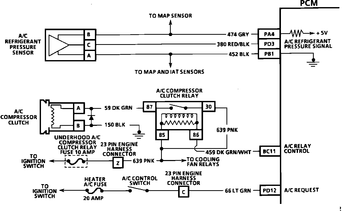 The PCM uses this signal to adjust the idle speed, and on some models engages the A/C compressor clutch. If this signal is not available to the PCM, the engine idle may be rough when the A/C compressor cycles. In some cases the A/C compressor will be inoperative.